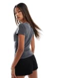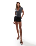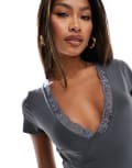 Fashionkilla double layered slinky plunge lace trim t-shirt in slate grey