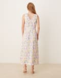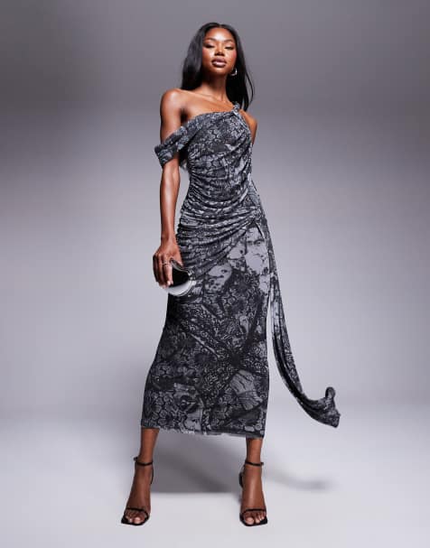 ASOS DESIGN mesh asymmetric off shoulder midi dress with hitched drape sash in floral abstract print