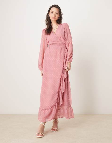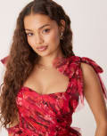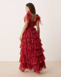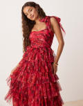 Lace & Beads Petite bow shoulder tiered tulle maxi dress in pink and red rose