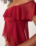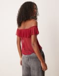 ASOS DESIGN ruffle bardot split front top in burgundy