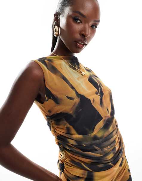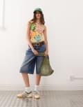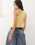 COLLUSION one shoulder fitted top with sunset beach graphic in buttermilk yellow