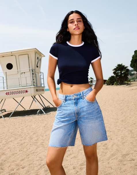Bershka baggy denim bermuda jorts in mid blue