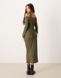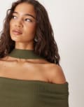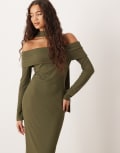 ASOS DESIGN ribbed bardot midi dress with scarf detail in khaki