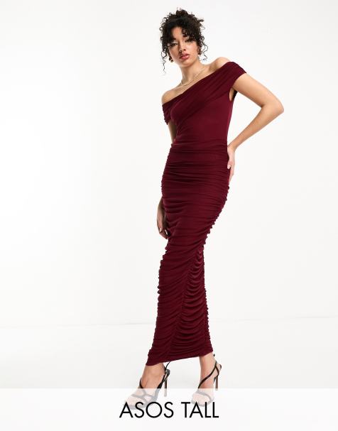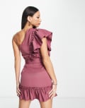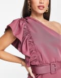 ASOS DESIGN Tall one shoulder detail belted frill mini dress in berry