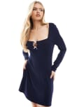 Miss Selfridge square neck pink satin bow mini dress in navy